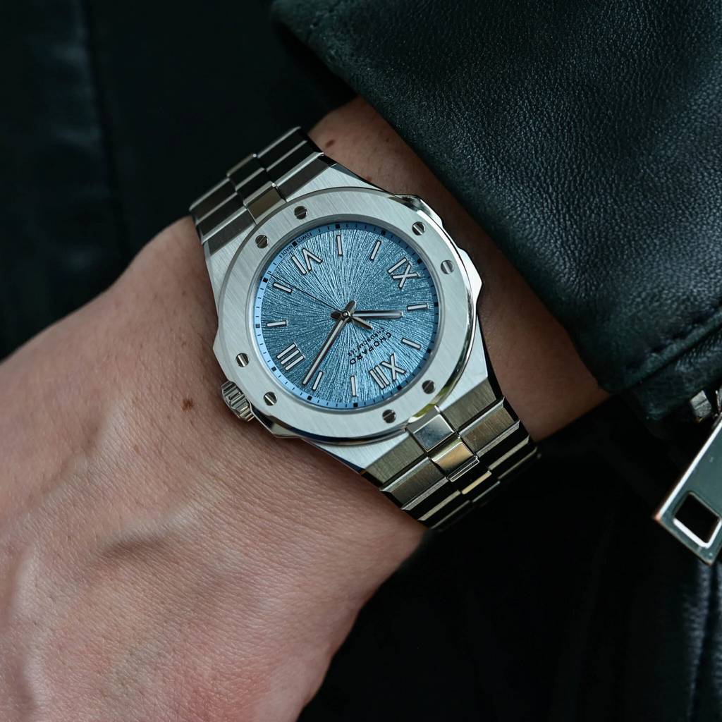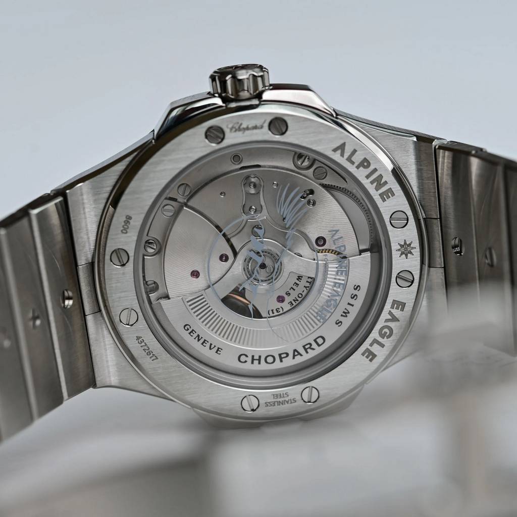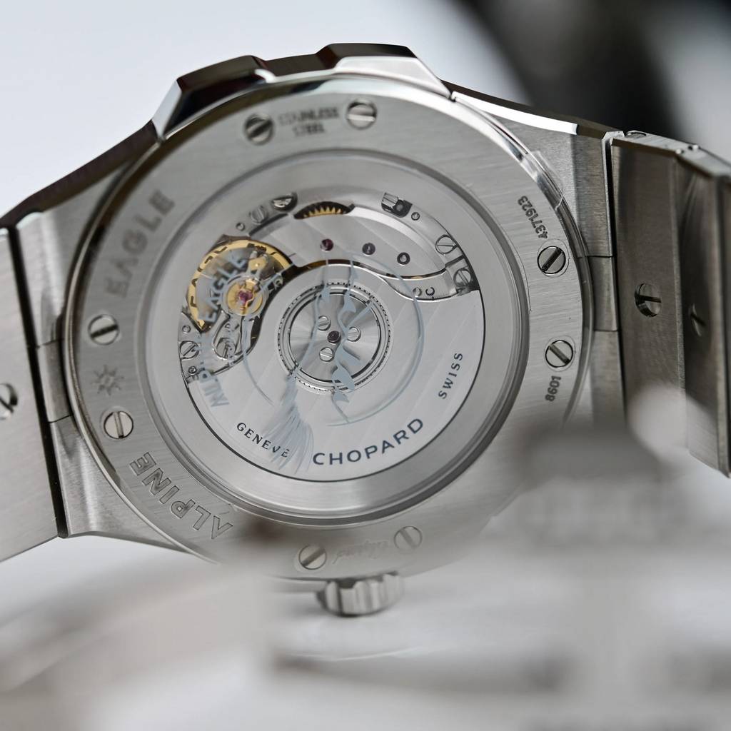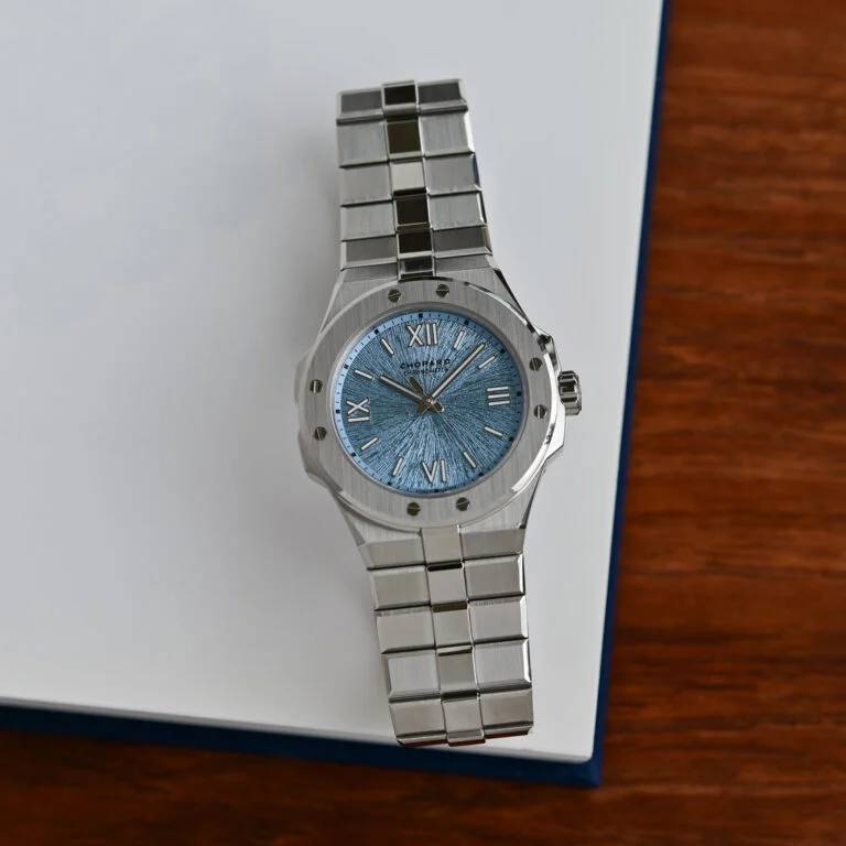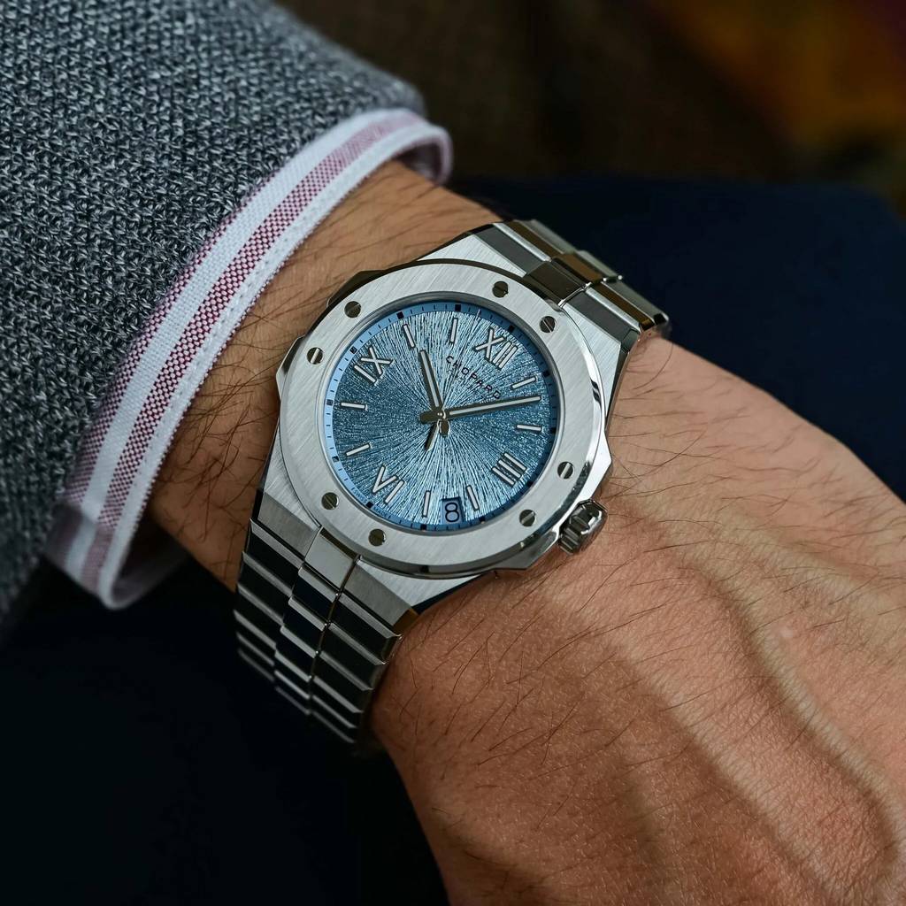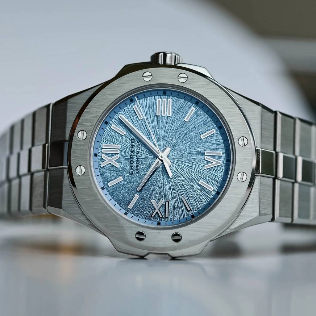 Первое знакомство: новые Chopard Alpine Eagle 41 мм и 36 мм в цвете «Rhone Blue» pods, 19 апреля, 2026 Представленная в 2019 году коллекция Chopard Alpine Eagle очень быстро стала фирменной линией роскошных спортивных часов дома, узнаваемой по интегрированному браслету, рифлёному безелю с восемью выровненными винтами и фактуре циферблата, вдохновлённой радужкой орлиного глаза. Снова возвращаясь в центр внимания, версия Alpine Eagle с индикацией времени и даты выходит в корпусах из Lucent Steel размером 36 и 41 мм с новым циферблатом цвета Rhone Blue. Хотя сходство может быть не столь очевидным с первого взгляда, родословная Alpine Eagle восходит к модели St. Moritz 1980-х годов — первым стальным спортивным часам Chopard, созданным Карлом-Фридрихом Шойфеле с эффектным безелем. Хотя некоторые черты спортивной модели St. Moritz — интегрированный браслет с полированным центральным звеном, восемь функциональных винтов на безеле, римские цифры и батонные метки, а также корпус формы tonneau — были сохранены, Alpine Eagle была вдумчиво переосмыслена как утончённые современные спортивные часы. Коллекция выпускается в размерах корпуса 33 мм, 36 мм, 41 мм и 44 мм и включает модели с индикацией времени и даты, хронографы, турбийоны, скелетонизированные версии, ультратонкие исполнения и даже высокочастотную модель — все они оснащаются мануфактурными механизмами с сертификацией COSC. Lucent Steel, фирменный сплав Chopard, был представлен вместе с первой моделью Alpine Eagle в 2019 году и с 2023 года используется во всех стальных часах Chopard. Изготовленный на 80% из переработанной стали, Lucent Steel отличается исключительной твёрдостью и стойкостью к истиранию, а по блеску сопоставим с золотом. Новинки представлены в корпусах формы tonneau из Lucent Steel размером 41 мм x 9,75 мм и 36 мм x 8,45 мм, с вертикальной сатинировкой поверхностей и ярко полированными фасками. Круглый безель с восемью выровненными винтами — дизайнерская черта, унаследованная от оригинальной модели St. Moritz. Заводная головка с защитой, украшенная гравировкой в виде розы ветров, завинчивается и обеспечивает водонепроницаемость корпуса до 100 метров. Интегрированный браслет из Lucent Steel плавно продолжает линии корпуса и оснащён широким центральным звеном в форме слитка с полированной накладкой — ещё одна отсылка к оригинальной St. Moritz. Главная новинка здесь — новый цвет циферблата Rhone Blue, нанесённый на поверхность, предварительно отштампованную с лучистым рисунком, напоминающим узор радужки орла. Этот синий тон вдохновлён альпийским истоком реки Рона. Начав свой путь в леднике Рона в кантоне Вале на высоте более 2200 метров, воды знаменитой реки приобретают серо-голубой оттенок, отражающий осадочные частицы, захваченные ледником. Накладные индексы с родиевым покрытием — сочетание римских цифр и батонных меток — а также часовая и минутная стрелки покрыты составом Super-LumiNova. На центральной секундной стрелке можно увидеть фирменный противовес в форме орлиного пера, а у 41-миллиметровой модели дата расположена под углом в позиции 4:30 на сером фоне. У версии 36 мм этой функции нет. Обе модели оснащаются мануфактурными автоматическими механизмами с сертификацией хронометра COSC. Версия 41 мм использует калибр 01.01-C с запасом хода 60 часов, а более компактная модель 36 мм оснащается калибром 09.01-C с запасом хода 42 часа. Розничная цена версии 36 мм составляет 12 400 швейцарских франков, а версии 41 мм — 15 400 швейцар