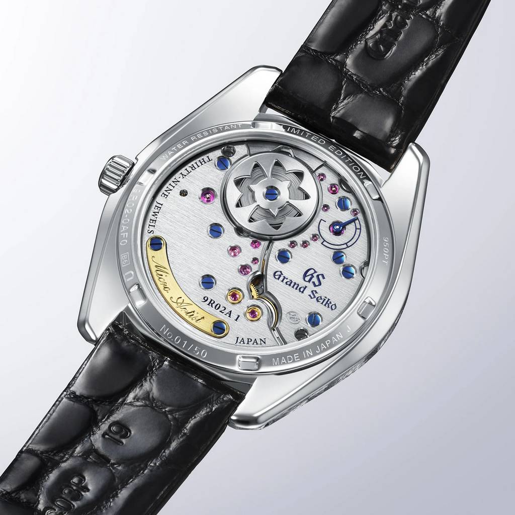 Как указывает табличка на циферблате, эта роскошная платиновая версия оснащена тщательно исполненным механизмом Spring Drive с ручным заводом калибра 9R02 — самым тонким механизмом Spring Drive на сегодняшний день. Разработанный как ультрапремиальный механизм для творений Micro Artist Studio, тонкий калибр толщиной 4 мм сочетает в себе точность кварцевого регулирования с красотой и долговечностью механического калибра. Двойная структура заводных пружин и система возврата крутящего момента обеспечивают впечатляющий запас хода в 84 часа (индикатор запаса хода расположен на задней крышке). Механизм украшен мостами с ручной отделкой, ярко отполированными фасками и тонкой продольной шлифовкой, а также имеет ажурный цветок колокольчика — символ Сиодзири — над барабаном и золотую табличку с гравировкой «Micro Artist».